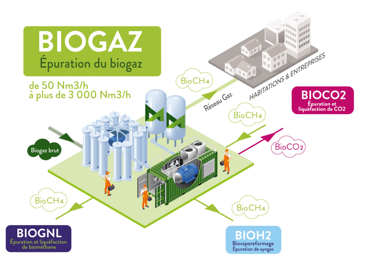 Particulièrement bien adapté aux gros débits de biogaz à traiter ainsi qu’aux biogaz « complexes »
