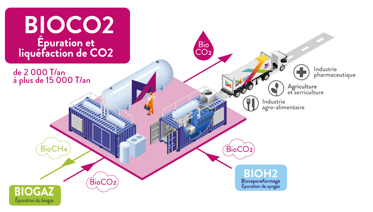 Le CO₂, quant à lui, peut être capté, purifié et valorisé au lieu d’être rejeté à l’atmosphère.